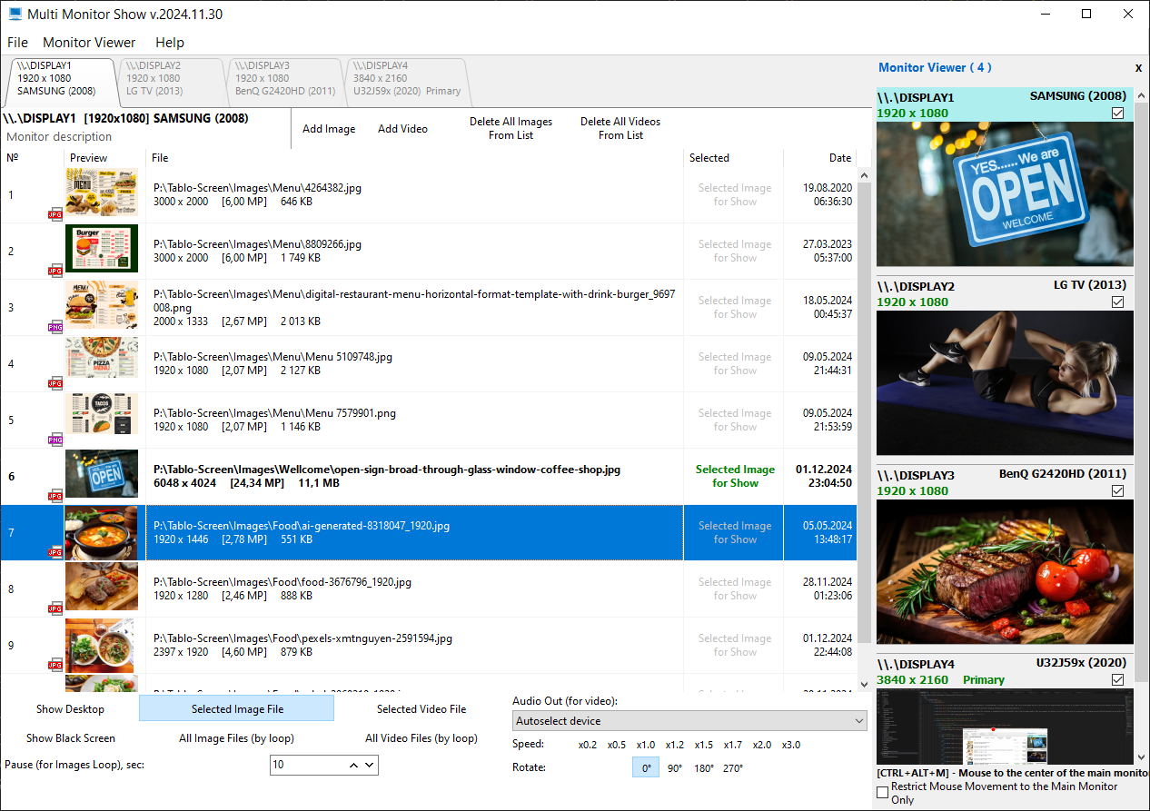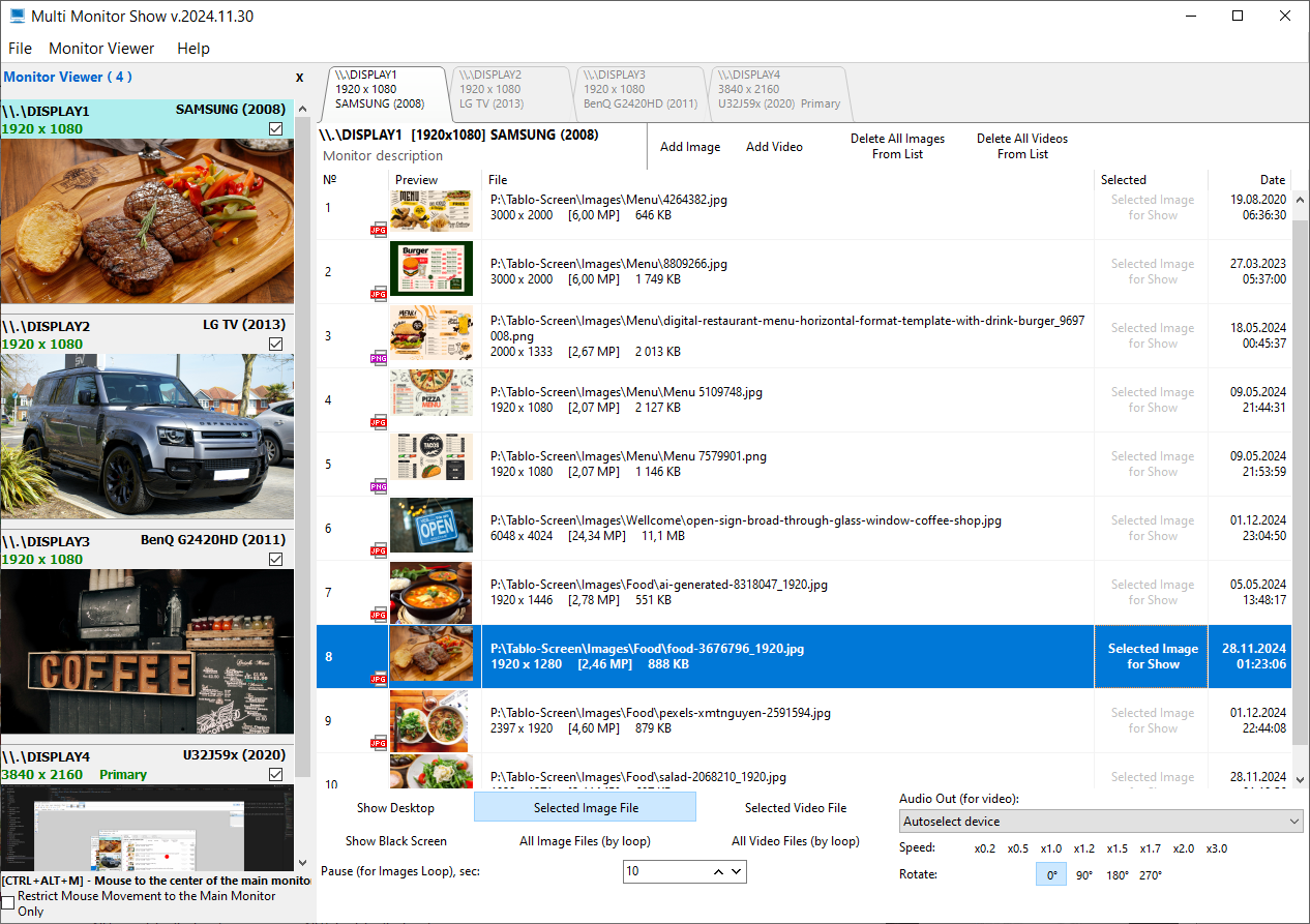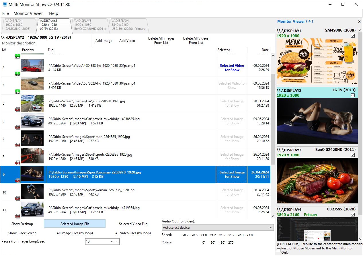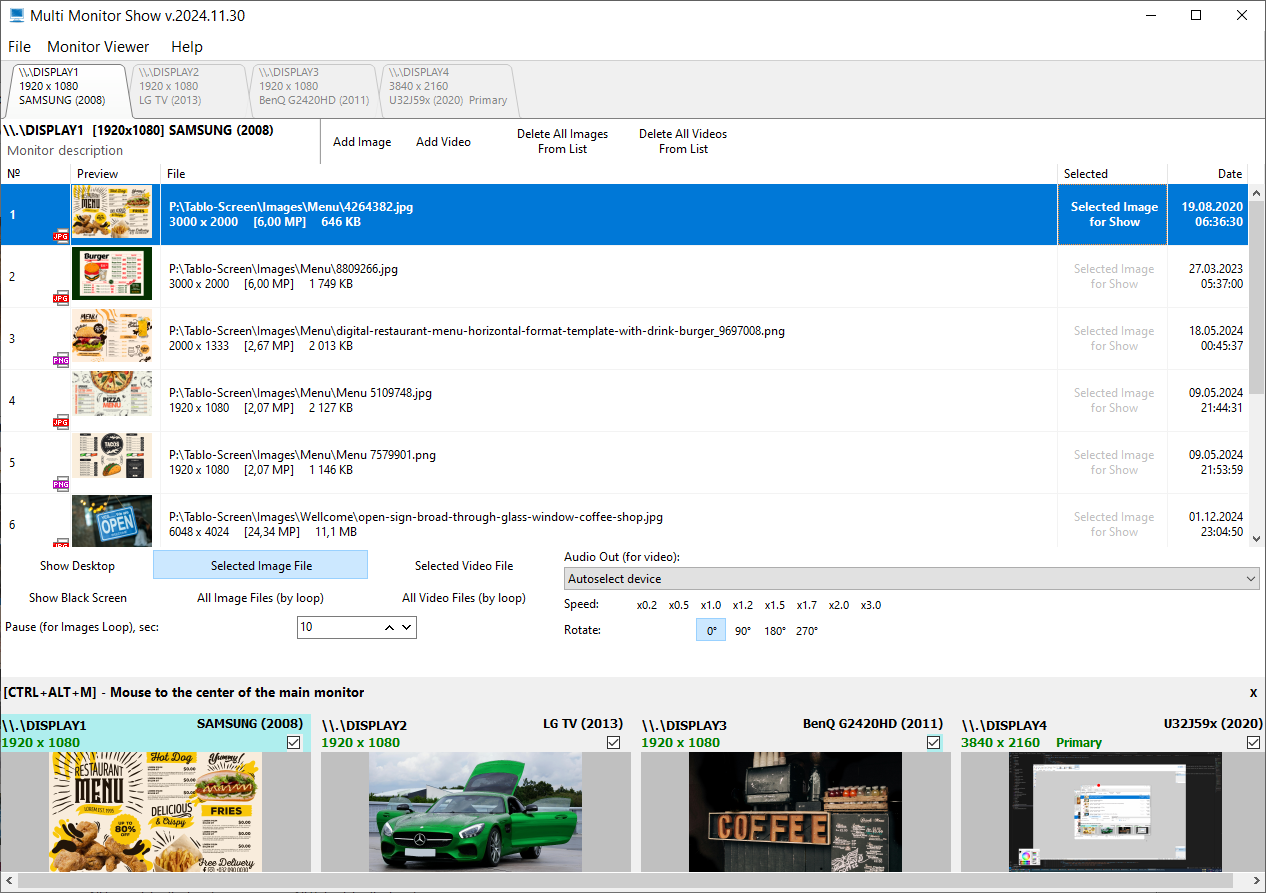 Thus, you can use your additional monitors (large TVs, projectors) as information boards with convenient control from the «Multi Monitor Show» program from the primary monitor, while your computer can continue to be used in everyday work on the primary monitor. The program can work with both horizontal and vertically rotated monitors and rotate the image (photo and video) by 90°/180°/270° if necessary.
