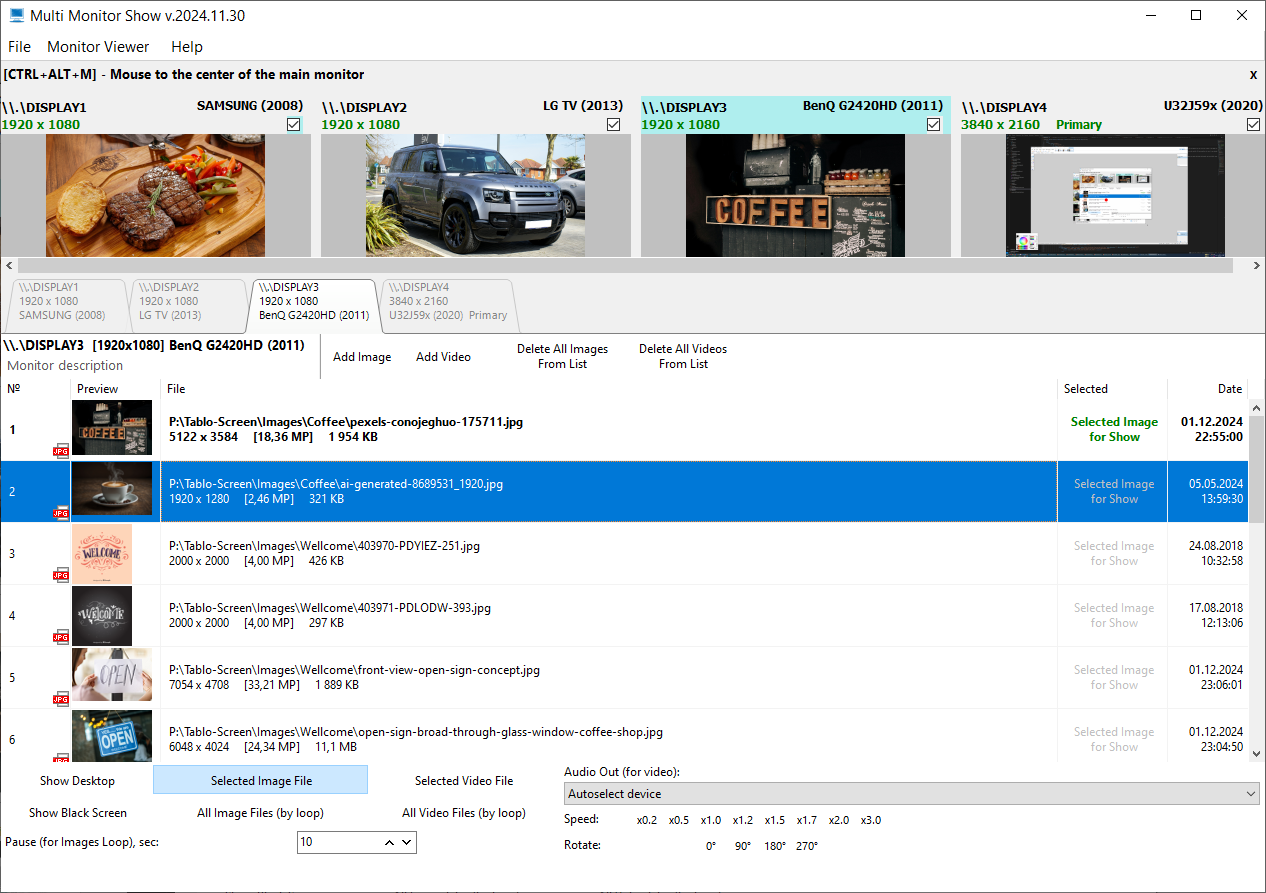 - Displaing a set of graphic images from files (*.jpg, *.jpeg, *.png, *.bmp, *.gif, *.tiff, *.webp and others) in a loop on any of the additional monitors.