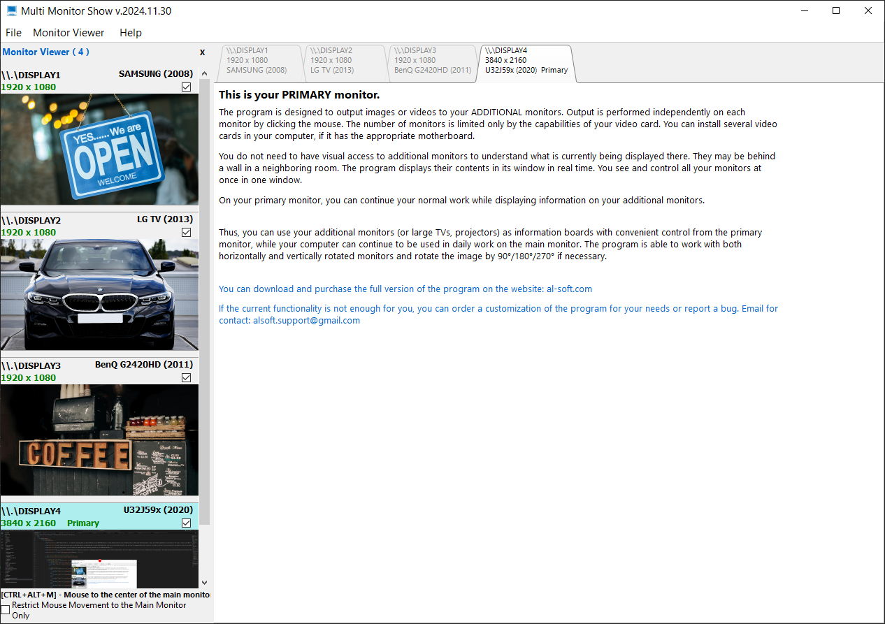 «Multi Monitor Show» is designed to show graphic information or video on your ADDITIONAL monitors, turning them into information boards or photo-video advertising players. Output and control is carried out independently on each monitor. The number of monitors is limited only by the capabilities of your PC, there are no restrictions in the program. You can install several video cards in the computer, if it has the appropriate motherboard.